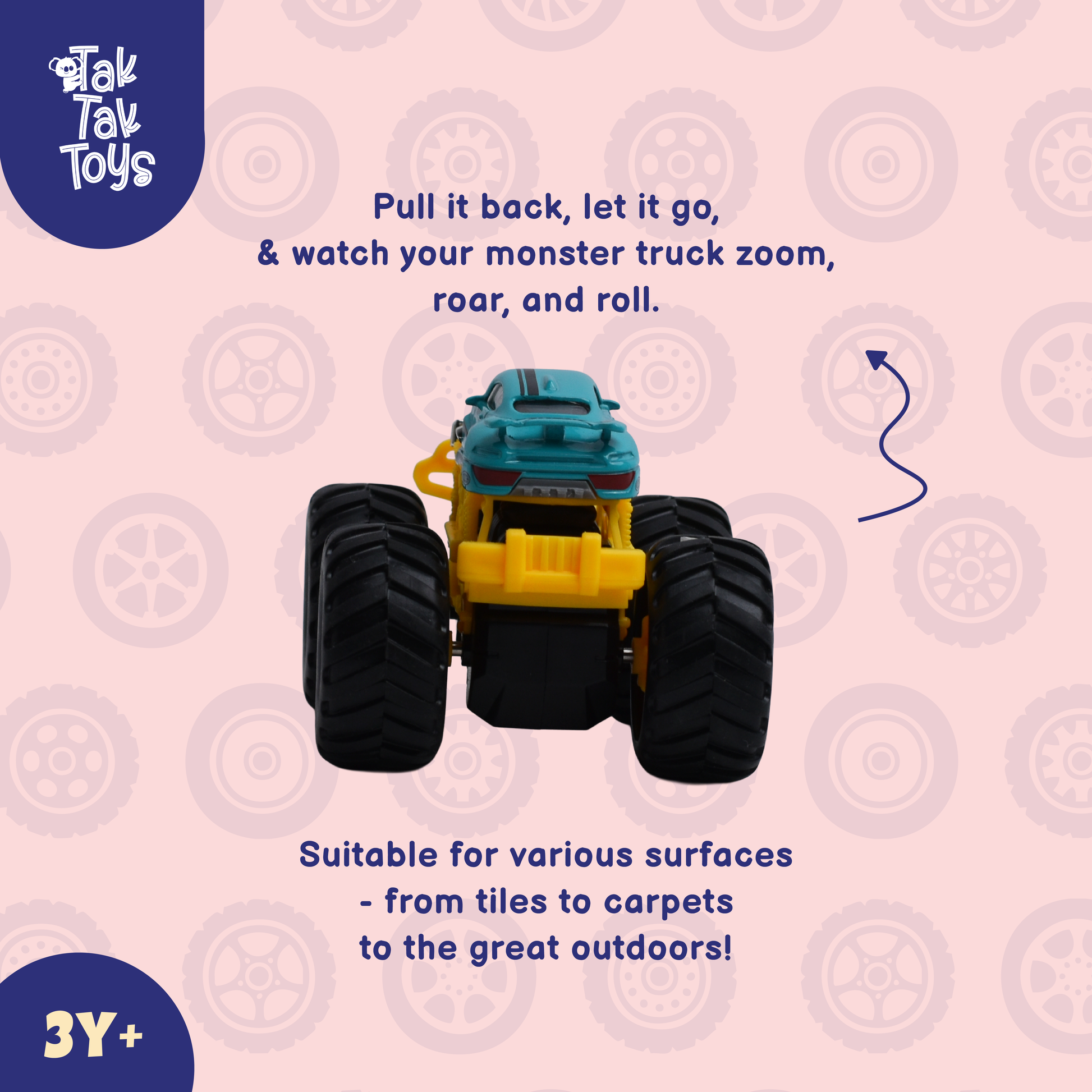 Get ready for thrilling action with this Tak Tak Toys 1:64 Scale Turbo Truck Pull Back Toy Car! Built for speed and adventure, this monster-style truck comes with extra-large wheels and a tough body for smooth off-road play. Just pull it back and watch it zoom forward—no batteries required! Perfect for kids aged 3 years and above, this toy enhances hand-eye coordination, imaginative play, and motor skills. Made with high-quality, non-toxic materials, it’s designed to handle endless racing fun.