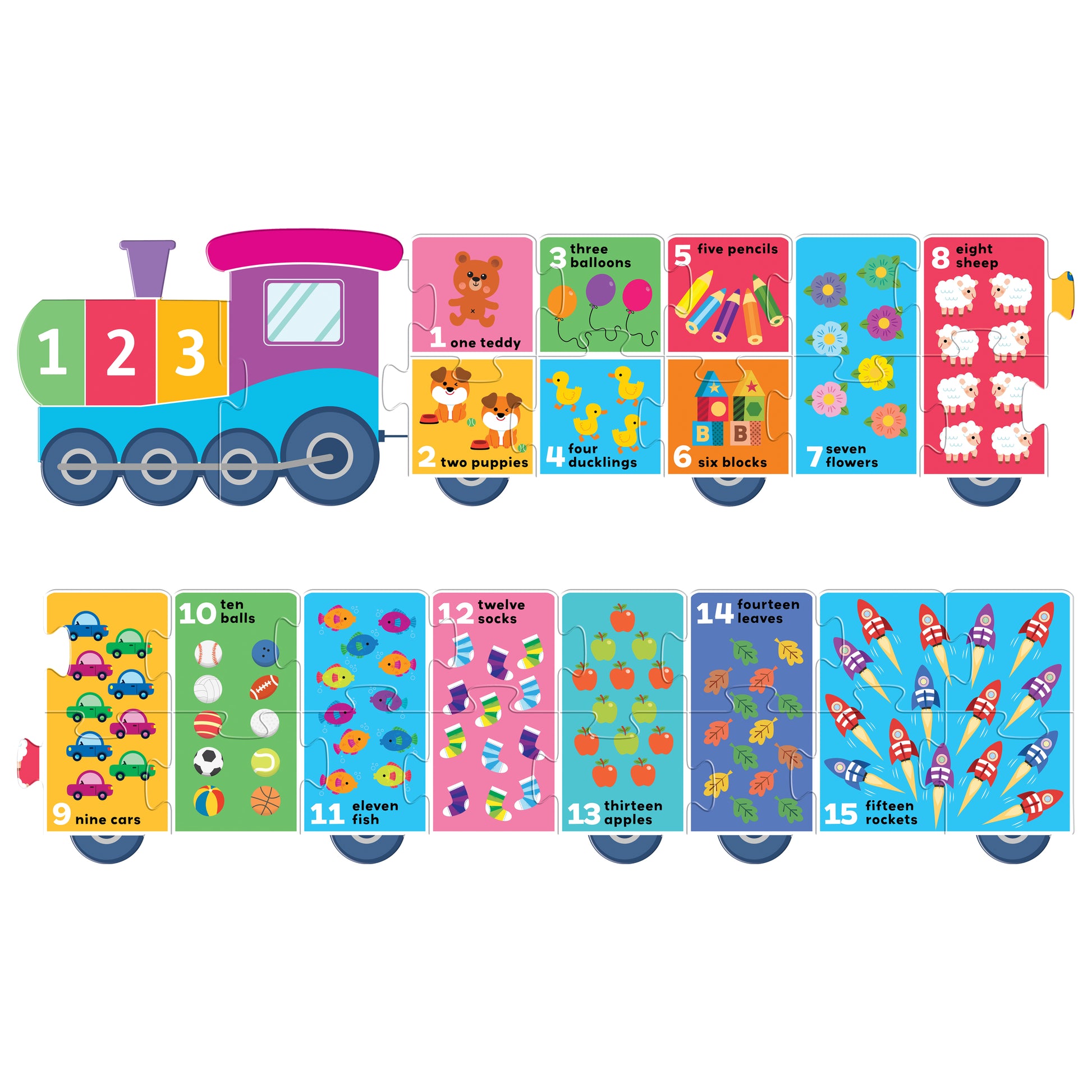 This 28-piece jigsaw transforms into an impressive long train, featuring bold numerals, number words and bright, engaging images to help little learners master their numbers.